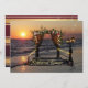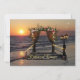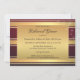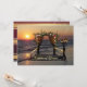 Una romántica invitación a cenar con un puerto rosa con luces de cuerda en la playa al atardecer. En la parte trasera hay un diseño elegante con rayas borgoñas y doradas.