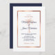 Invite a sus huéspedes a que le ayuden a celebrar su día especial con esta elegante invitación que incluye escritura moderna, cobre de oro rosa y texto azul marino, incluyendo una palmera artística y marco de cobre rosa metálico en la parte delantera. En la parte posterior de la tarjeta hay un fondo azul marino de coordinación. Si necesita ayuda o un pedido de un personalizado, por favor contáctame.