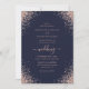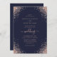 Elegante invitación a una boda de oro azul marino y rosa con purpurina/confeti de oro rosa enmarcando los detalles del boda con un moderno tipo de letra de escritura.