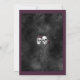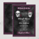 Invitación de boda oscura y hermosa con la frase Hasta que la muerte nos separe, cráneos de esqueletos con rosas y un fondo negro sombrío sobre fondo púrpura. La parte trasera de la invitación tiene calaveras juntas. Perfecto para una boda gótica o de Halloween.