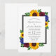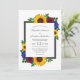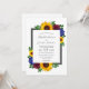 El diseño presenta elegantes girasoles, rosas y flores silvestres con una paleta de colores dorados amarillo, burdeos y azul. El diseño también incluye un marco gris de carbón vegetal. Puede cambiar el color de fondo en la parte delantera y de vuelta al color de su elección o dejar ambos en blanco.
