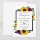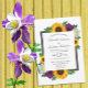 El diseño presenta elegantes girasoles, rosas y margaritas con una paleta de colores dorados amarillo, morado y blanco. El diseño también incluye un marco gris de carbón vegetal. Puede cambiar el color de fondo en la parte delantera y de vuelta al color de su elección o dejar ambos en blanco.