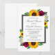 El diseño presenta elegantes girasoles, rosas y margaritas con una paleta de colores dorados amarillo, burdeos y blanco. El diseño también incluye un marco gris de carbón vegetal. Puede cambiar el color de fondo en la parte delantera y de vuelta al color de su elección o dejar ambos en blanco.