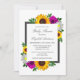 El diseño presenta elegantes girasoles, rosas y margaritas con una paleta de colores dorados, amarillo, rosa/morado y blanco. El diseño también incluye un marco gris de carbón vegetal. Puede cambiar el color de fondo en la parte delantera y de vuelta al color de su elección o dejar ambos en blanco.
