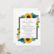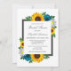 El diseño presenta elegantes girasoles, rosas y margaritas con una paleta de colores dorados amarillo, verde azulado y blanco. El diseño también incluye un marco gris de carbón vegetal. Puede cambiar el color de fondo en la parte delantera y de vuelta al color de su elección o dejar ambos en blanco.