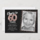 Elegante invitación a fiesta de cumpleaños número 60 con un elegante fondo negro que se puede cambiar a cualquier color, una foto del chica de cumpleaños / chico, un rosa purpurina brillante de oro, sesenta rosas globos de helio de oro y una plantilla de texto moderna de celebración de cumpleaños número 60 que es fácil de personalizar.