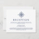 Tarjetas de invitación de recepción con tema náutico que presentan una rosa de los vientos de estilo vintage y un fondo a rayas blancas y azules marino en el reverso.