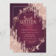 Moderno, moda y glamuroso Sweet 16 con goteo purpurina y marco retro sobre un fondo borgoñoso.