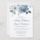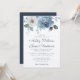 Invitación a una boda rosa de marfil azul oscuro con caligrafía de escritura manuscrita elegante y tipografía clásica, y un toque elegante de rosas pintados con acuarela en una lujosa paleta de color azul y marfil. La parte trasera de la tarjeta está en un color azul oscuro. Diseñado exclusivamente para usted por Happy Dolphin Studio!