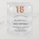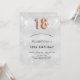 Una invitación moderna, elegante y glamurosa para una fiesta de 18 años. Un fondo falso plateado, decorado con chispas. Personalice y agregue su nombre y detalles del fiesta. El número 18 está escrito con un tipo de letra, guión, estilo de globo de oro subió.