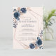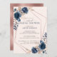 Moderna y de moda, esta magnífica ducha virtual de matrimonio se caracteriza por su diseño de diseño, con un color de agua rosa polvoriento y azul marino adornado con una falsa geométrica de rosa dorado adornada con flores y rosas color azul marino. Terminado con una hermosa textura de oro rosa en la parte posterior. Parte de un conjunto de coincidencias. Copyright Elegant Invita. Todos Los Derechos Reservados.