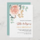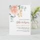 Un fondo blanco moda. Decorada con un gran oro rosa y florido rosado, flor rosa y hojas de eucalipto de color verde acuático, espirales, vegetación y una falsa espiral de oro. Personalice y agregue su nombre y detalles del fiesta. Atrás: color de fondo verde sabio.