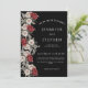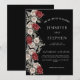 Una elegante invitación a una boda acuarela con un borde a la izquierda con rosas rojos y blancos y vegetación de eucalipto sobre un fondo negro. Personaliza con los detalles de tu día especial.