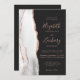El borde izquierdo de esta elegante y moderna invitación a la boda se caracteriza por una pasarela de acuarela gris y blanca recortada con un falso purpurina de oro rosa. El texto del personalizable combina la escritura a mano de color rosa, el copperplate y las fuentes cursivas en un fondo negro de pizarra. El reverso proporciona espacio para los detalles del boda en un fondo de pizarra sólida, junto con un código QR que los huéspedes pueden explorar para visitar su sitio web y RSVP, lo que ahorra el coste de imprimir y enviar tarjetas RSVP separadas.
