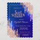Moderno, moda y glamuroso Sweet 16 con goteo purpurina en un fondo azul.