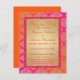 Esta vibrante tarjeta de "save the date" para boda inspirada en el Sari del este de la India en tonos rosa intenso, fucsia y naranja tiene un patrón damasco dorado con un borde de brillo FALSO rosa (IMPRIMIDO, no real) en ella. Los colores ricos la hacen perfecta para una boda étnica, boda musulmana o boda del este de la India. ****POR FAVOR TOME NOTA de que ninguno de los elementos de esta invitación está elevado o grabado. Todo está impreso plano. Esta invitación sería perfecta para una ceremonia de boda india, hindú, sánscrita o musulmana en primavera, verano, otoño o invierno, fiesta de compromiso, aniversario u otra fiesta de boda. Además, si cambia el tamaño de la invitación, o si cambia las fuentes, o el tamaño de la fuente, parte del diseño y/o texto puede cortarse. Todo se imprimirá como lo ve en su monitor. No veré su invitación, y Zazzle NO corregirá nada (errores tipográficos, alineación, etc.). El texto y el papel son totalmente personalizables. Si necesita ayuda con esta invitación, por favor envíeme un correo electrónico ANTES de realizar su pedido. Si requiere otros artículos coincidentes o le gustaría que se agregaran otros elementos de diseño