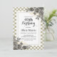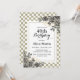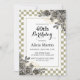Esta elegante invitación de cumpleaños a la flora incluye flores de rosa doradas y negras con arreglo de hojas en el fondo blanco y salado a cuadros.