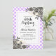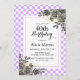 Esta elegante invitación de cumpleaños a la flora incluye flores de rosa doradas y negras con arreglo de hojas en el fondo blanco y malva a cuadros.