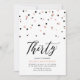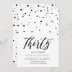 Celebra tu día especial con esta mínima invitación de cumpleaños número 30. Este diseño cuenta con un elegante guión de letras "Thirty" (Treinta) con confeti en forma de hexágono con una combinación de color oro negro y rosa. Hay más diseños disponibles en mi tienda BaraBomDesign.