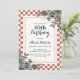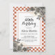 Esta elegante invitación de cumpleaños a la flora incluye flores de rosa doradas y negras con arreglo de hojas en el fondo blanco y rojizo a cuadros.