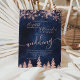 Es hora de celebrar su boda invernal maravilloso, con este lujoso purpurina de oro rosa con chispas de nieve y rosa bosque de pinos purpurinas de oro en un elegante fondo acuático azul marino, con una moderna tipografía de escritura fresca.