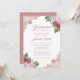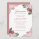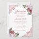 Hermosa invitación floral a la fiesta de la quinceañera con flores rosa y rosa rubor con un rosa de encaje floral dorado.