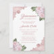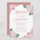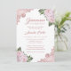 Hermosa invitación floral a la fiesta de la quinceañera con flores rosa y rosa rubor con un rosa de encaje floral dorado.