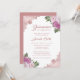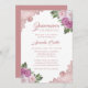 Hermosa invitación floral a la fiesta de la quinceañera con flores rosa y rosa rubor con un rosa de encaje floral dorado.