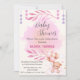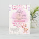 Esta invitación a la ducha de bebé tiene un fondo rosa pastel y un oso de peluche adorable sostiene globos. Las hojas decorativas y las estrellas colgantes dan un toque de clase. El texto es elegante y perfecto ya que invita a los invitados a celebrar la llegada de una niña.