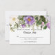 Lavanda, púrpura y flores antiguas marfil con hojas verdes esmeralda profundas en una tarjeta de respuesta RSVP. Arte botánico vintage de flores de jardín con hojas de helecho silvestre recogidas en el bosque y follaje. El reverso tiene un fondo de lavanda gris suave. Derechos de autor, Audrey Jeanne Roberts.