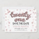 Elegante diseño "21st Birthday Fiesta Save The Date" con Rosa de letras de globo de oro y confeti de Purpurina, nombre personalizado y texto de detalles. Impresione a su familia y amigos con este diseño elegante y glamuroso. Fácil de usar y fácil de personalizar. ¡No te quedes sin el tuyo!