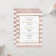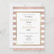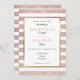 Elegante purpurina rosa de oro y invitación a la boda a rayas blancas con letras de oro y negro de moda. Personalice con su información especial sobre el día de la boda en un texto moderno. Diseñado por Thisisnotme©