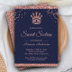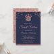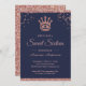 Invite a sus huéspedes con esta elegante y dulce invitación de dieciséis personas, con una hermosa corona de oro rosa y una moderna tipografía de fondo azul. Simplemente agregue los detalles de su evento en esta plantilla fácil de usar para convertirla en una invitación única. Girar la carta para revelar una textura falsa rosa de purpurina de oro en la parte posterior de la tarjeta.