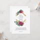 Invitación a la boda de la Rosa Roja con rosas rojas acuarelas, hojas de eucalipto y marco de diamante geométrico dorado. La plantilla está lista para que añada los detalles de la invitación de la parte delantera, así como las iniciales del monograma de novia y novio en la parte posterior. Tema floral botánico con tipografía simple y elegancia moderna.