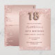 Una invitación moderna, elegante y glamurosa para una fiesta de cumpleaños número 18 de los chicas. Un rosa falso de fondo metálico dorado con un elegante goteo rosa de purpurina dorado, pinta goteo. El nombre está escrito con un guión moderno de estilo con letras de color rosa oscuro y dorado. Personalice y agregue los detalles de su fiesta. El número 18 se escribe con un tipo de letra, guión.