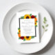 El diseño cuenta con elegantes girasoles, rosas y flores silvestres con una paleta de colores dorados amarillos, rojos y naranjas. El diseño también incluye un marco gris de carbón vegetal. Puede cambiar el color de fondo en la parte delantera y de vuelta al color de su elección o dejar ambos en blanco.