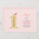Celebra tu día especial con esta moderna invitación de cumpleaños. Este diseño presenta tipografía purpurina de oro "1" con un lindo gorra fiesta. Esta sencilla y bonita invitación será perfecta para una fiesta de cumpleaños de chica rosado y oro.
