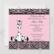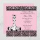 Invitación adorable de Baby Shower que ofrece una cebra rosada con un fondo rosado de la raya de la cebra. Artículos a juego disponibles en nuestra tienda. También disponible en azul y verde menta en nuestra tienda.