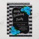 Elegante purpurina de rayas negras y plateadas y rosas azules invitan a fiestas de cumpleaños para mujeres de cualquier edad. Se puede cambiar la edad para cualquier edad. El texto se puede cambiar a cualquier cosa para que se ajuste a su evento. ¡Las fuentes, el color de la fuente y el texto son completamente personalizables! La forma y el tipo de papel se pueden personalizar para adaptarlo a su presupuesto y a su gusto.