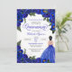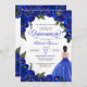 Invitación quinceanera en rosa azul real con acentos dorados y un chica con elegante vestido de bola. Consulte la tienda para ver esta invitación con chicas de diferentes colores de cabello y tonos de piel.