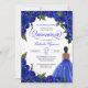 Invitación quinceanera en rosa azul real con acentos dorados y un chica con elegante vestido de bola. Consulte la tienda para ver esta invitación con chicas de diferentes colores de cabello y tonos de piel.