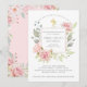 Estas hermosas y elegantes primeras invitaciones a la Santa Comunión presentan un marco de encantadores rosas de acuarela rosa con hojas verdes y falsos acentos de oro rosa, y un suave texto gris sobre un fondo blanco limpio para un look que logra ser a la vez moderno e inspirado en la cosecha. También hay una falsa cruz dorada. En la parte posterior de la invitación se muestra un marco floral a juego sobre un fondo rosa suave y ruidoso.
