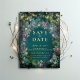 Boda forestal encantada guardar la fecha | Tema de Tale Woodland de hadas | Esta encantada boda forestal salvó la fecha con exuberante vegetación, follaje colgante y ramas de árboles adornadas con luces de hadas en un falso efecto dorado, creando un ambiente romántico y mágico. Un marco de rosas rosa, morado y crema fucsia aporta un toque floral de lujo, mientras que el brillante fondo verde esmeralda realza la estética mística de cuento de hadas. Perfecto para una boda de primavera, verano, otoño o invierno, este elegante y moderno ahorro de la fecha es ideal para novias que adoran un entorno de hadas, bodas de bosques, temática de hadas, románticos diseños de rosas y una paleta de colores de verde esmeralda y oro. Ya sea que esté planeando un boda místico de cuentos de hadas, una ceremonia de inspiración botánica, o una celebración caprichosa de los bosques, esta floral de lujo salva la fecha captura la magia de un boda forestal de ensueño.