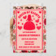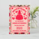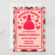 Una carta retro inspirada en la Reina de los Corazones Rosas y Alicia en la maravillosa fiesta de cumpleaños con tema de tierra de maravillas diseño de invitación a la invitación a la fiesta de cumpleaños en una paleta de colores rojo brillante y rosa con detalles de rosas y corazones.