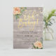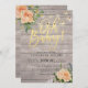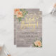 Plantillas de tarjetas de invitación de Baby Shower - Guión de Relieve metalizado dorado falso con luces florales y de cadena de rosas blancas de color rosa pálido sobre fondo de madera rústica. Todos Los Estilo De Texto, Los Colores Y Los Tamaños Se Pueden Modificar Para Ajustarse A Sus Necesidades.