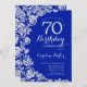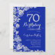 Invitación a la fiesta de cumpleaños número 70 de Royal blue floral. Diseño elegante con rosas, Relieve metalizado falso plateado y tipo de letra de guión de tipografía. La carta de invitación a la moda es perfecta para una elegante celebración de cumpleaños femenina. Se puede personalizar a cualquier edad. Invitaciones Zazzle impresas o una plantilla imprimible digital de descarga instantánea.