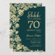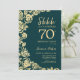 La floral de oro verde esmeralda sorprende la invitación a la fiesta de cumpleaños número 70. Diseño elegante con rosas, Relieve metalizado de oro falso y tipografía tipo guión. La carta de invitación a la moda es perfecta para una elegante celebración de cumpleaños femenina. Se puede personalizar a cualquier edad. Invitaciones Zazzle impresas o una plantilla imprimible digital de descarga instantánea.