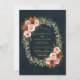 La elegancia reina en esta moderna y formal invitación a la boda de otoño con un tema floral botánico. Un ilustracion acuarela de marco oval de eucalipto y vegetación, con dos esquinas florales de melocotón y rosas ondulados con follaje y vegetación de cobre y terracota, decora esta elegante y sofisticada plantilla de invitación a la boda de otoño con un fondo verde oscuro. Una buena elección para una boda en otoño en los meses de septiembre, octubre y noviembre. Perfecto para parejas que aman el arte acuarela, los temas botánicos, los temas florales y los diseños clásicos tradicionales y modernos.
