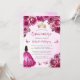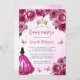 Esta encantadora invitación a la quinceañera tiene un borde de rosas fucsia rosas sobre un fondo de color rosa. Una tiara dorada, un chica de pelo oscuro vestido con una princesa fucsia y pequeñas mariposas rosas decoran el texto. La palabra "Quinceañera" y el nombre del invitado de honor aparecen en elegante escritura fuchsia, con el texto restante en letra gris sans serif.
