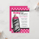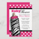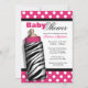 Invitaciones elegantes de Baby Shower diseñadas con los lunares blancos sobre rosas fuertes, y la atracción de un biberón del estampado de zebra.